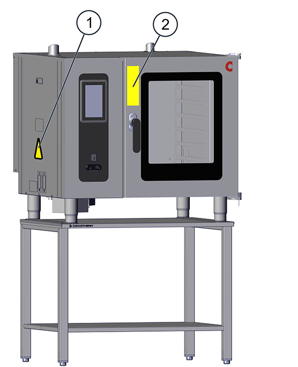 Die folgenden Warnhinweise müssen immer gut sichtbar auf dem Kombidämpfer und dem optionalen Zubehör in den gekennzeichneten Bereichen angebracht sein.